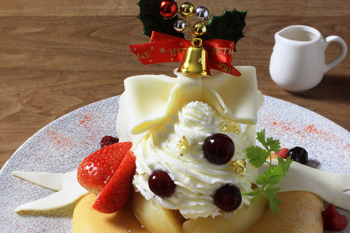 濃厚な生チョコとアイス、いちごを合わせた新作「生チョコモンブランパンケーキ」。